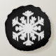 A delicate, lacy snowflake pattern on a solid background with a striated, Ikat woven texture - white snowflakes on a black background round pillow