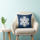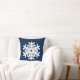 A delicate, lacy snowflake pattern on a solid background with a striated, Ikat woven texture - white snowflake on a dark navy / indigo blue background square pilloe