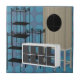 Design incorporating Ikea products: Expedit shelving unit on casters, Rönnskär shelving unit, and Ikea Stockholm glass-door cabinet.
