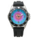 A colourful illuminated design in aqua blue and pink/orange.This clock is manly and sporty,and features a black rubber strap and a protector.Perfect for your partner or son. Note .This is not a led product.