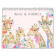 Watrcolor illustration of animal families of giraffes, elephants, deers, woodland animals, birds, lions, penguins, flamingos and giant panda bears. Theme "Wild and Homely".
