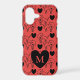 Modern illustrated cat pattern dotted with hearts on red background and heart monogram.