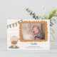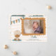 Adorable baby photo birth announcement with an illustration of a little duck and a garland in gender neutral colours. Illustrated and designed by Patricia Alvarez.