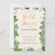 This customisable bridal shower invitation features an illustrated border of green, grey and blue flowers with a cream colour background (that can be changed to your liking). The text "Bridal Shower" is in a gold (simulated foil), modern script font. The bride-to-be's name and event details can be customised for your special event. The back side is a matching cream colour (also changeable) with an overlaying gold quatrefoil pattern.