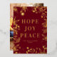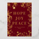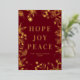 A stunning typographic gold foil holiday photo card featuring a beautiful detailed gold foil festive themed illustrated frame comprising leaves, doves and snowflakes, and the editable headline "Hope Joy Peace" on a red background. Add your photo to the reverse.