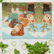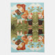 Illustrated picnic scene with animals in hats and overalls. They enjoy nature, surrounded by trees, hills, and a blue sky. Playful and whimsical tone.