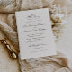 The invitation features an off white background, offering a serene and classic canvas that enhances the minimalist design. The elegant charcoal grey font, inspired by vintage calligraphy, adds a touch of sophistication and warmth. This carefully selected typography complements the artistic elements, ensuring your wedding details are presented with style and clarity.
