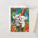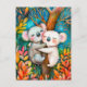 Illustration of koalas hugging in eucalyptus fores postcard