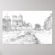 Illustration, in sketch style, of Notre Dame de Paris and a boat on Seine river - Paris, France