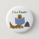 A cool button for young readers, a cartoon bookworm, he's busy reading with a stack of books beside him. Customise as desired.