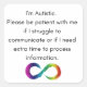 This sticker is a simple yet effective way to communicate to others that you or a loved one is autistic and may need additional support or accommodations. The message is clear and easy to read, making it a great tool for autistic individuals to use in a variety of situations, from school or work to social events. It's a perfect way to raise awareness about autism and promote understanding and inclusivity.