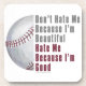 Baseball Art Don’t Hate Me tshirts, gifts, and accessories created by ITD Sports Centre feature our original artwork of white with red stitching baseball on the left side with the words in grey and red on the right, Don’t Hate Me Because I’m Beautiful, Hate Me Because I’m Good. Our fun sports accessories and gifts are perfect for baseball lovers, baseball players, baseball stars, baseball coaches, and sports lovers of all ages. It’s all fun and games at Imagine That Design Sports Centre.