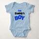 I'm Daddy's Boy T-shirts, long sleeve tees, bodysuits including organic bodysuits, and football bodysuits, hats, rompers, dark T-shirts, raglan T-shirts, and other apparel with a bright blue and black text design that reads I'm Daddy's Boy!