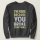 Great for tech support specialists and repairmen and women of all kinds to remind everyone exactly why they have shown up. It's because you broke something.