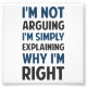 I'm not arguing...I'm simply explaining why I'm right! Perfect for those occasions when your rational explanation is being misconstrued as argumentative. Which is probably all the time.