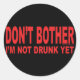 Don't Bother, I'm Not Drunk Yet. Funny drinking design, wear to the bar, raise a laugh and make a statement! Keep unwanted attention at bay with these unique stickers. Sticker your car, let the cops know you're not up for a DUI.