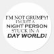 I'm Not Grumpy! I'm Just A Night Person Stuck In A Day World! Do you ever feel out of sync with the rest of the world See all our designs on on cups, mugs, tee shirts, sweatshirts, hats, and other gifts and clothing.