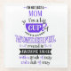 I'm not just a (insert name, occupation, hobby etc.). I'm a big cup of wonderful covered in awesome sauce with a splash of sassy and a dash of crazy in mixed black and bright blue-purple font with various adornments including a banner, teacup, swirls and leaves. "Mum" can be personalised with your message for example daughter, woman, girl, daughter, wife, sister etc.