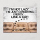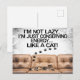 A lazy cat lounging comfortably on a soft surface, its body stretched out with paws dangling and eyes half-closed in pure relaxation. The cat seems to be completely at ease, basking in the warmth of the room, with a calm and content expression on its face. It's the perfect picture of laziness and bliss!