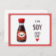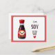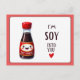 A cute and playful postcard featuring a smiling soy sauce bottle with the pun "I'm Soy Into You." Perfect for sending a sweet and quirky message to someone special.