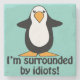 I'm surrounded by idiots! Funny and sarcastic insult with a black and white penguin with orange feet and beak graphic with a turquoise blue/green background cyan colour. Fully customisable.