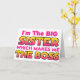 A cute and funny big sister saying. Big sisters will love wearing this saying- I'm the big sister, which makes me the boss. These products make great gifts for the big sister who thinks she's the boss.