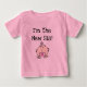 An adorable baby girl with a pink bow and pink pacifier and black text that reads "I'm the New Sis!" on baby sister T-shirts, bodysuits, tote bags, and more which you can customise on the spot with text or a name!