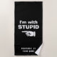 I'm with stupid pointing finger his and hers funny matching beach towel for couples. Humourous beach towels with fun quote and pointing sign. Personalised gift idea for him and her. Unique gift ideas for men and women. Large size for beach or pool. Create your own extra large towels for married couple, best friends, retiree, retired person, pensioner, family, husband and wife, co worker, colleague, boss, employee, mum, dad, sister, brother, aunt, uncle, grandpa, grandma, manager, coach, office worker, partner, son, daughter, vacationer, couple, newly weds, newlyweds, bride and groom, mr and mrs, honeymooners etc. Fun modern typography template with hand and finger pointing to each other . Personalise with his or her name at the bottom. Black and white or custom background colour. Joke design with left or right pointing hand.