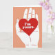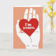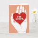This design shows an open, upward-facing hand in bright white, drawn with simple lines for the fingers and palm creases, reaching toward the viewer like a gentle offer 🥰. Centered in the palm sits a deep red heart that immediately catches the eye against a warm peachy-orange background. Inside the heart, the words “I’m yours.” appear in rounded white lettering, centered and easy to read. The hand’s open pose and the heart’s placement create a quiet sense of closeness, like someone holding their feelings out without flinching ❤️. The flat style keeps everything direct, with no heavy texture or shading, so the shapes and colors do all the talking. The strong contrast between the red heart and white hand adds a tender intensity, as if the promise is both brave and soft at the same time. The background remains a smooth peachy-orange field with no extra objects, framing the hand and heart as the only focus.