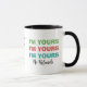 Here's a fun mug that makes a great Valentine's Day gift, especially when filled with your sweetie's favourite candy! Green, red, and blue text says "I'm Yours" three times, with black script below that says "No Refunds". The text is repeated twice on the mug, with three text fields at the middle that you may customise. Cute, and will definitely bring a smile!