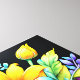 The composition is filled with various flowers and foliage rendered in vivid, almost luminous colours, including hot pink, brilliant yellow, electric blue, and deep purple. The style is highly decorative and digital, with a glossy finish that makes the colours pop dramatically. The focus is on the intense contrast between the vibrant, fantastical flora and the deep black void, giving the arrangement an energetic and bold aesthetic.