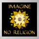 Gold and bronze lotus with purple and violet highlights and a purple peace sign in the middle asks you to "Imagine No Religion."