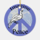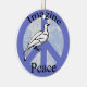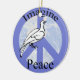 A white dove on a purple blue peace sign covers the planet earth. Imagine Peace.