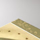 This is a beautiful image of the Immaculate Heart of Mary with pink roses and lilies. Stars surround her head. Mary has her hands crossed over her heart. Gold decorative garnishes border the image of Mary.