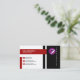 A simple design centred on rectangular columns. In the red column sits your name and job title. Directly below, there is a thin vertical red rectangle which accompanies its social icon buttons for your card details. At the right wall, there's a large black rectangle that has the logo and its inverted business name by the side. Overleaf, the card has two portions. The upper white piece has the logo and business name. The red column directly underneath has the business details along with its slogan tagline option. If you decide to upload a photo instead of a logo, the dimensions are 1,000 x 1,000 pix. This design has lots of option which allows you to customise the card. This card would be great especially for heads of companies or the upcoming boss in you.