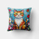 Cat themed throw pillow. A cute orange cat sitting in flowers and surrounded by butterflies. The art is in an impasto oil paper quilling style.