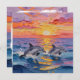 An ai impasto style dolphins swimming with a pink, orange and purple sunset over the ocean . A beautiful coastal blank card write a note to a friend or family member.