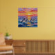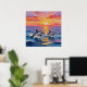 An ai impasto style dolphins swimming with a pink, orange and purple sunset over the ocean . A beautiful coastal poster wall art piece for your beach home or beachy styled home.