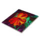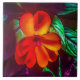 This 6” Ceramic Tile features an original photograph by ZoeSPEAK of a red orange impatiens flower. Sunlight adds yellow highlights to the petals and brightens the green leaves, giving a crisp edge to the purple shadows on the leaves below.