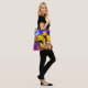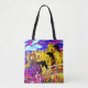 All over print ~ original collage and design by Aleta. Art on an earth conscious reusable tote. Bright, colourful image of a three crows or blackbirds taking flight, over a footbridge in a bright fanciful garden. Impressionistic homage to VanGogh, Monet and Manet. With perhaps a touch of Poe.