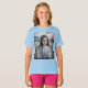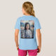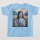 This is an impressionist-style portrait of a girl t-shirt. The painting features vibrant, mesmerising iridescences. The girl has long, dark hair and she is wearing a white dress with lace. She is standing in a field of flowers. The background is an ethereal landscape with mountains, trees and colours in the sky. The word Daughter is in pretty text at the bottom of the image. The t-shirt is a light blue t-shirt.