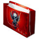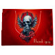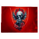 Impressive, realistic skull with wings placed in the centre of the composition. The skull is detailed with meticulous detailing that highlights the fine structures of the bones and the texture of the skull. The surfaces are finished with subtle blue and grey shades that give the skull depth and dimension. These colour nuances create a fascinating contrast to the bright red background and emphasise the sombre aesthetic of the design.