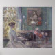 Improvisation (1899) by Childe Hassam is a vintage fine art impressionism portrait painting featuring a a woman playing the piano near an open window and pink flowers in vases.