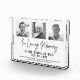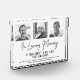 In loving memory wedding memorial acrylic block with 3 photos in black and white (a coloured option is available in the shop) and space to personalise the text and add the names or any custom message. The example reads "of those forever in our hearts today and always". White simple calligraphy design for the reception or ceremony.