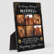 Personalised dog photo plaque featuring 6 precious pictures of your beloved pet, gold heart pawprints & glitter, the text "in loving memory of", your dogs name, birth/death dates, and the sympathy quote "your presence we miss, your memory we treasure, loving you always, forgetting you never".