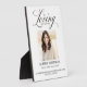Personalise this simple elegant funeral memorial plaque with the name and dates of your loved one. Modern elegant script typography on a clean white background. Perfect addition to your funeral memorial remembrance event and a keepsake. Easy to customise photo and text. Our heartfelt condolences on your loss.