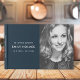 Modern, simple photo memorial guest book to celebrate the life of your loved one in a modern minimalist design style in navy blue. The template design can easily be personalised with your own photo and text to create a special tribute to your loved one or as part of thier funeral, memorial or celebration of life. The image shown is for illustration purposes only to be replaced with your own photo. The placeholder image is of a beautiful woman with wavy blonde hair wearing a spotty top and is shot in monochrome black and white.