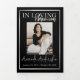A heartfelt and dignified way to honour and remember your loved one. Designed with utmost care and attention to detail, this invitation combines the timeless elegance of silver with the solemnity of black, creating a truly refined and respectful memorial keepsake. Personalisation is at the heart of this invitation, allowing you to honour your loved one's memory in a unique way. The front of the invitation is adorned with the phrase "In Loving Memory," a gentle reminder of the profound bond you shared. The elegant design creates a serene ambiance, setting the tone for a meaningful and heartfelt memorial service. Add all your personalised information into the editable spaces and add two additional photos for the back.