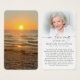This peaceful memorial prayer card design pairs a warm ocean sunset with a softly faded photo and elegant In Loving Memory typography. Gentle waves and golden light create a calming backdrop that reflects comfort, gratitude and lasting love. Thoughtfully designed for a funeral, memorial service or Celebration of Life, this keepsake offers family and friends a meaningful way to honor a life remembered with compassion and grace. Its small and portable size of 3.5x2" (wallet-sized) makes it convenient for loved ones to carry it with them as a reminder of your loved one’s life and spirit. Personalization makes each card unique.