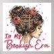 Charming illustration featuring a woman with her hair in a bun and flowers in her hair. Inside her head we see a tall bookcase full of books. There is a woman climbing a ladder to reach the books. The colourful text reads: "In my bookish era". This design is available on a wide variety of products.